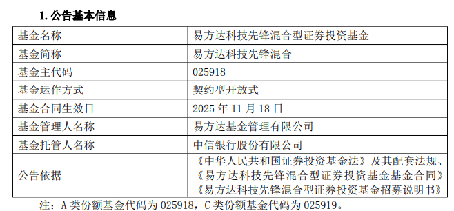 中国经济网北京11月19日电 今日,易方达基金管理有限公司就易方达科技先锋混合型证券投资基金合同有效性发布公告。融资期内认购净额为1,989,419,983.77元,融资期内认购资金应计利息为121,683.82元,募集股份总数为1,989,541,667.59元。基金经理 蔡荣成先生现任易方达基金管理有限公司基金经理。曾任易方达基金管理有限公司基金经理助理、研究总监助理、行业研究员。
